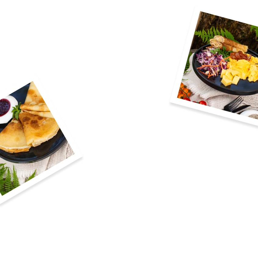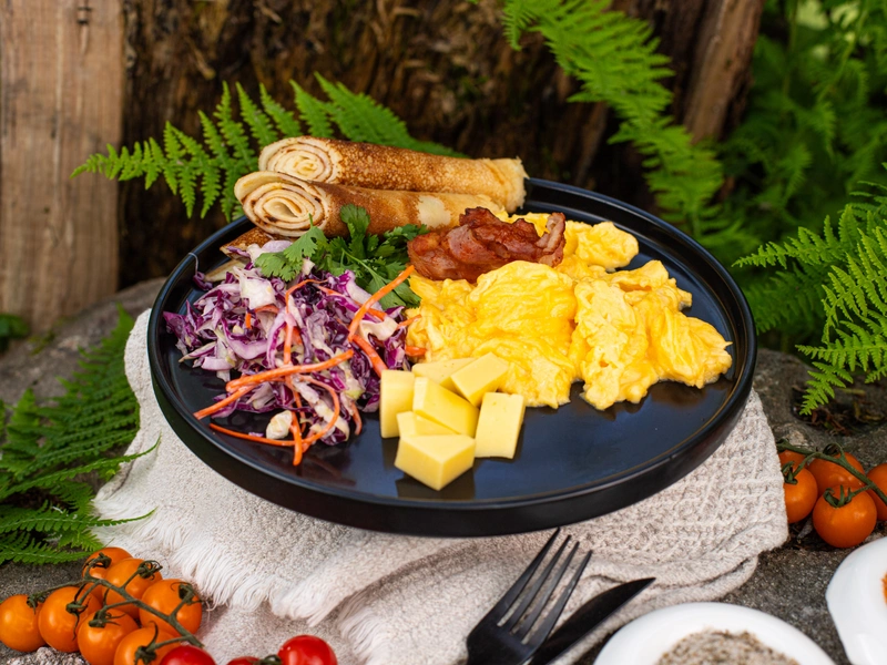 Салат коул-слоу, блинчики 2 шт., сыр, скрэмбл, бекон гриль, горячий напиток на выбор