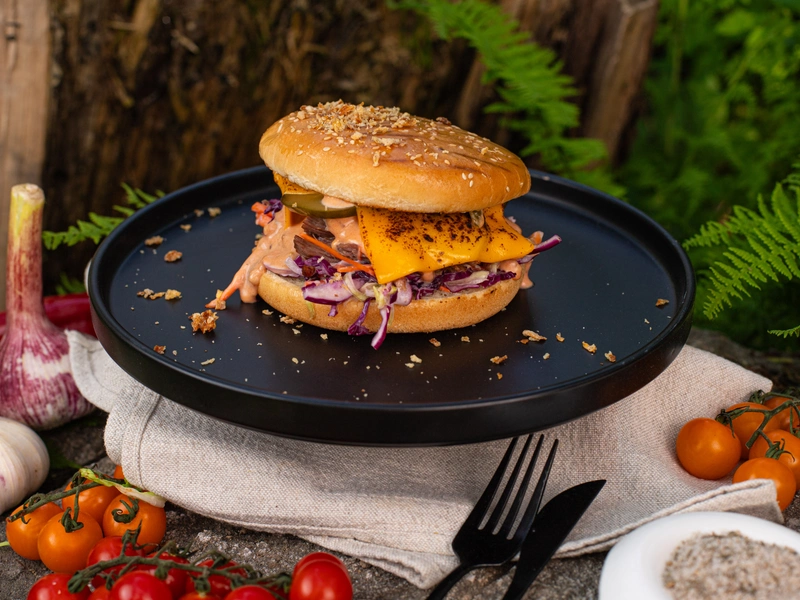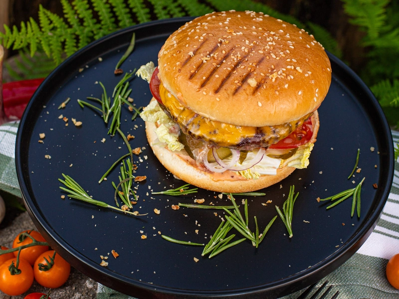 Булочка, котлета, сыр Чеддер, салат китайский, огурцы маринованные, лук красный, соус фирменный